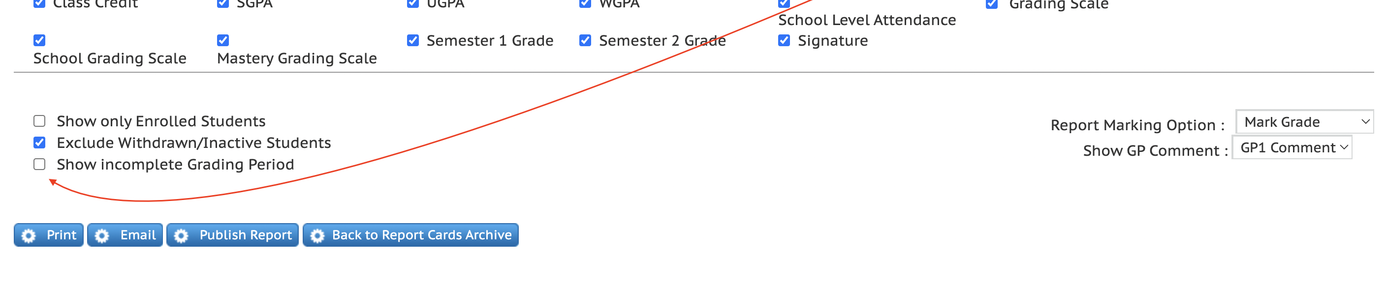 Report Card - Show Incomplete Grading Period If you are creating your Report Card before the end of the official Grade Period end date, you'll need to select the option to "Show Incomplete Grading Period";