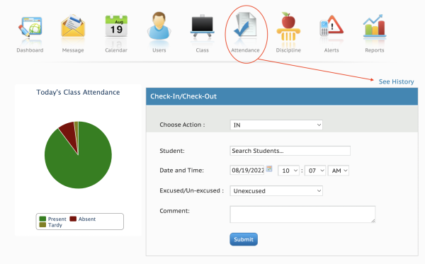 As an admin, you will handle the students' late arrivals and early departures from campus through the Attendance icon in your Admin dashboard menu, in the Check-In/Check-out box.