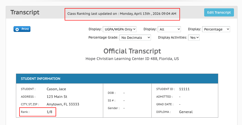 After calculations are finished, you can review your transcripts to see the ranking and print them, if needed.