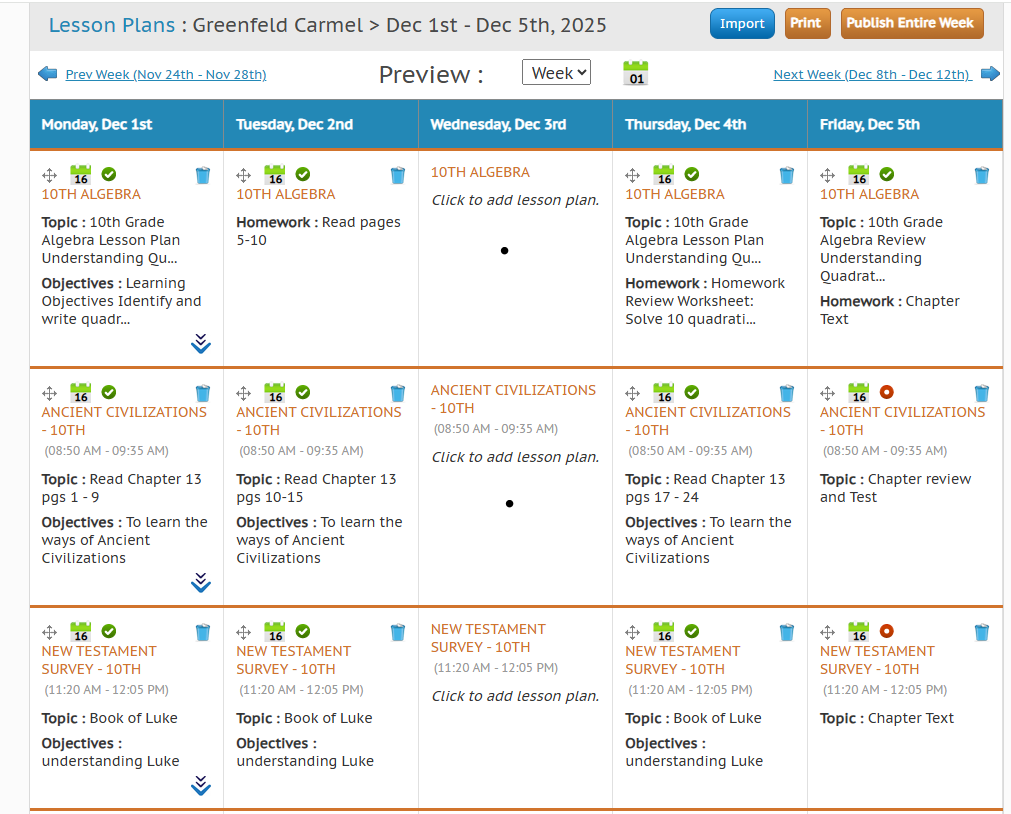 After filling out the whole week you have the option to hit Publish Entire Week. Publishing allows you to show only specific sections (or all) of the lesson plans to your student and parents.