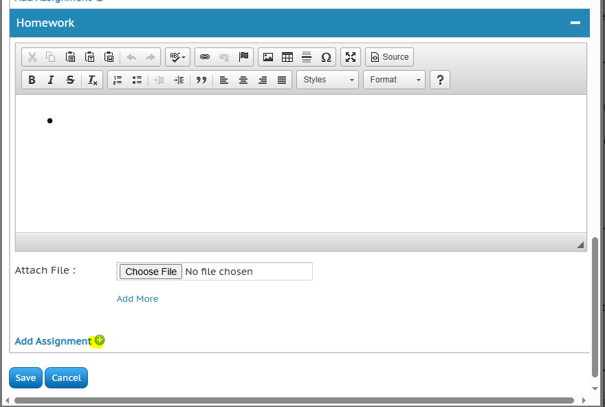 In some areas you will have an "Add Assignment" option. This will allow you to add in assignments you are grading, like, homework, quizzes, tests, etc. You will see an "Assign Date" which is the date you are on creating this lesson plan and assignment, the "Due Date" is the actually date this assignment is due on.